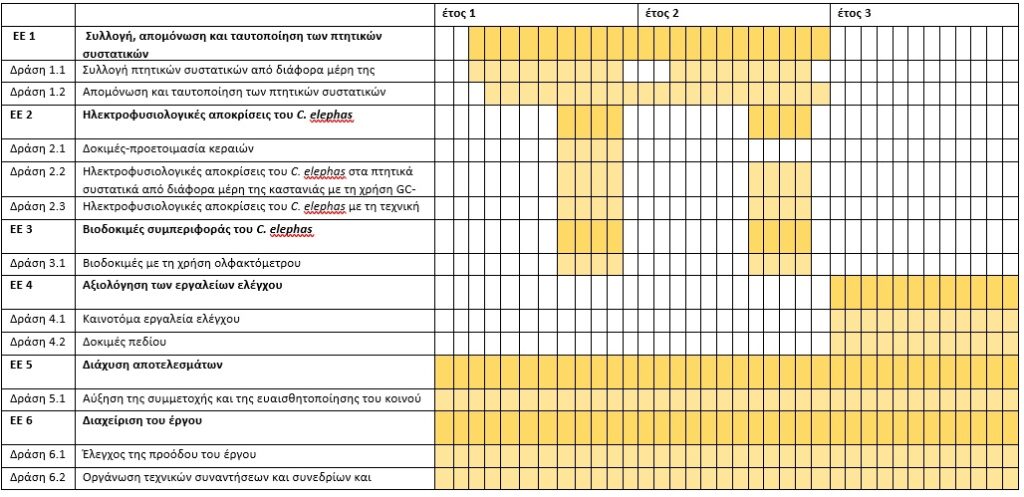 Η εκτίμηση των ηλεκτροφυσιολογικών αποκρίσεων του εντόμου στο φυτικό υλικό που θα συλλεχθεί θα μελετηθεί στην ΕΕ2. Το ηλεκτροαντενογράφημα (EAG) που είναι η καταγραφή των μεταβολών που παρατηρούνται μεταξύ της βάσης και της κορυφής της κεραίας ενός εντόμου ως αποτέλεσμα ενός χημικού ερεθίσματος, που μπορεί να επηρεάζει τη συμπεριφορά του εντόμου. Πριν από τη διεξαγωγή μελετών EAG, θα γίνει βελτιστοποίηση του τρόπου σύζευξης της κεραίας του εντόμου στον ηλεκτροαντενογραφικό ανιχνευτή (Εργασία 2.1). Τα φυτικά εκχυλίσματα καστανιάς από διαφορετικούς ιστούς φυτών θα μελετηθούν με τη χρήση αέριας χρωματογραφίας συνδυασμένη με ηλεκτροαντενογραφικό ανιχνευτή (GC-EAD) (Εργασία 2.2) και με την τεχνική του ηλεκτροαντενογραφήματος (EAG) (Εργασία 2.3). Θα δοκιμαστούν επίσης ενεργά μεμονωμένα πτητικά συστατικά, καθώς και ενώσεις που είναι ενεργά σε άλλα γένη εντόμων και που είναι εμπορικά διαθέσιμα (Εργασία 2.3).